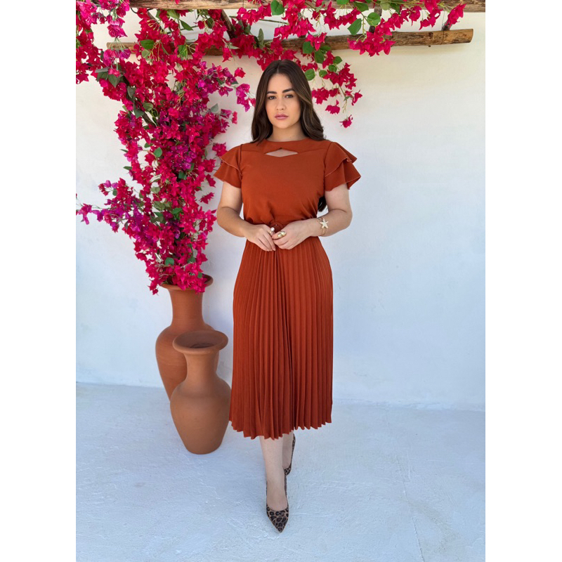 O plissado, que percorre toda a saia do vestido, traz um movimento leve e dinâmico ao andar, conferindo um toque de sofisticação e delicadeza à peça.